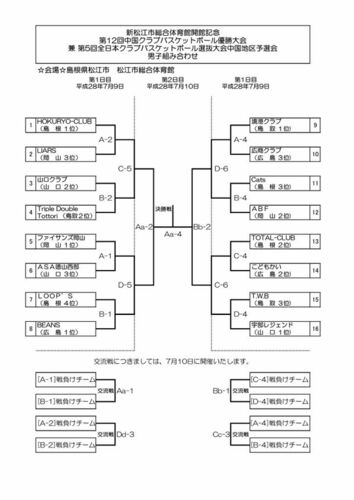 ■大会名 新松江市総合体育館開館記念 第12回中国クラブバスケットボール優勝大会 兼 第5回全日本クラブバスケットボール選抜大会中国地区予選会 ■期日 平成28年7月9・10日(土・日) ■会場 松江市総合体育館(島根県松江市) ■組合せ PDF版はこちら ※宇…