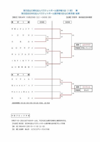 第5回山口県社会人バスケットボール選手権大会(1部)兼第5回全日本社会人バスケットボール選手権大会県予選 ■期 日 令和4(2022)年10月29日(土)、30日(日)■会 場 宇部市俵田翁記念体育館■結 果 勝ち上がり表 ※宇部市からは男子 宇部レジェンド、…