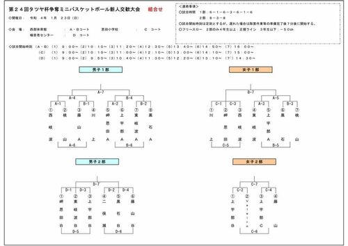 ※1/14 現在の新型コロナウイルス感染症が拡大している状況を受け、大会を延期しました。 第24回タツヤ杯争奪ミニバスケットボール新人交歓大会 ■期 日 令和4(2022)年1月23日(日) ■会 場 西部体育館、楠若者センター体育館、恩田小学校 ■組合せ P…